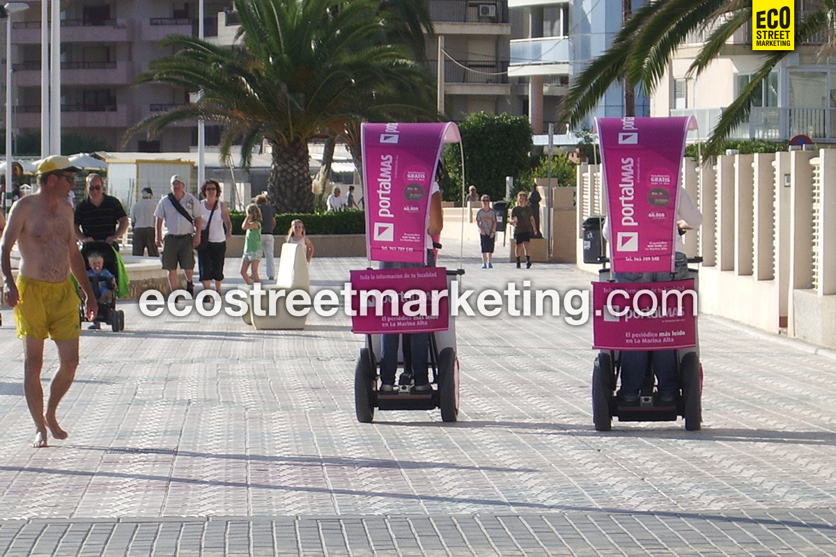 Nuestros soportes exclusivos para segways hacen que las campañas de publicidad street marketing con este medio sean únicos y capten la atención de todo el público objetivo de la zona. Contamos con mucha experiencia en este tipo de acciones por lo que podremos recomendar los mejores elementos publicitarios para que tu campaña con segway sea un verdadero éxito.